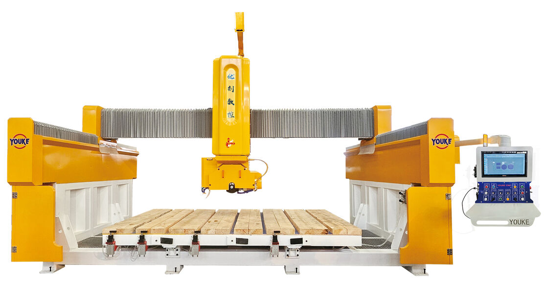 यह मशीन एक विशेष रूप से डिज़ाइन की गई 5-एक्सिस ब्रिज कटिंग मशीन है जिसे मानक स्लैब और जटिल, अनियमित आकृतियों की सटीक कटाई और प्रोफाइलिंग के लिए इंजीनियर किया गया है। यह बहुभुज, त्रिकोण, पंखे के आकार, काउंटरटॉप्स, दीर्घवृत्त, हीरे, वृत्त, बुलनोज़ किनारे, मनमाने कोण वाले चैम्फरिंग, साथ ही सीधी और घुमावदार रेखाओं सहित ज्यामिति की एक विस्तृत श्रृंखला को संसाधित करने में सक्षम है। इसकी उच्च कटाई गति, असाधारण सटीकता और उपयोगकर्ता के अनुकूल संचालन के साथ, यह सिंटर्ड स्टोन, संगमरमर, ग्रेनाइट, क्वार्टरज़ स्टोन और अन्य अनियमित या कस्टम-आकार के वर्कपीस जैसी सामग्रियों को संसाधित करने के लिए आदर्श है।